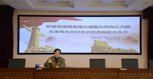 12月14日,东南电化公司党委书记洪晓云在公司党建活动室以“积极营建具有强大凝聚力和向心力的东南电化良好意识形态和政治生态”为主题开展意识形态专题党课宣讲,公司领导班子成员、全体中层干部、各车间部室主管及大班长共76人参加。